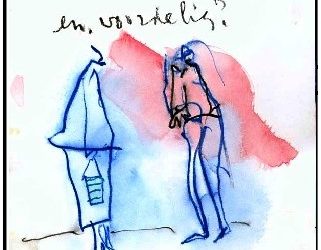 Emblema "Ik heb vandaag een mens bezocht." "En was hij vrolijk, tomeloos, Fraudeur, een minnaar, bolleboos?" "Misschien heb ik mezelf gekocht." (tekening Leo de Jong)